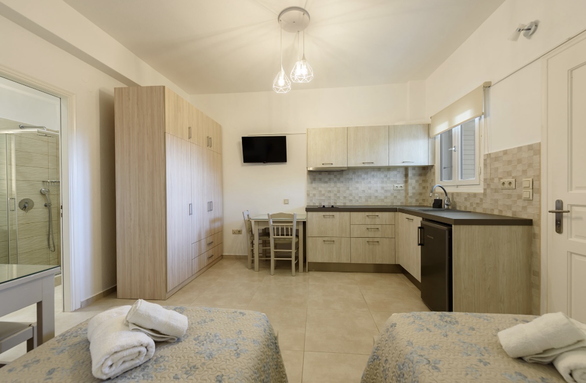 Surrounded by lush greenery, this peaceful studio is perfect for two. Featuring two single beds and a terrace, it offers a relaxing escape close to nature.